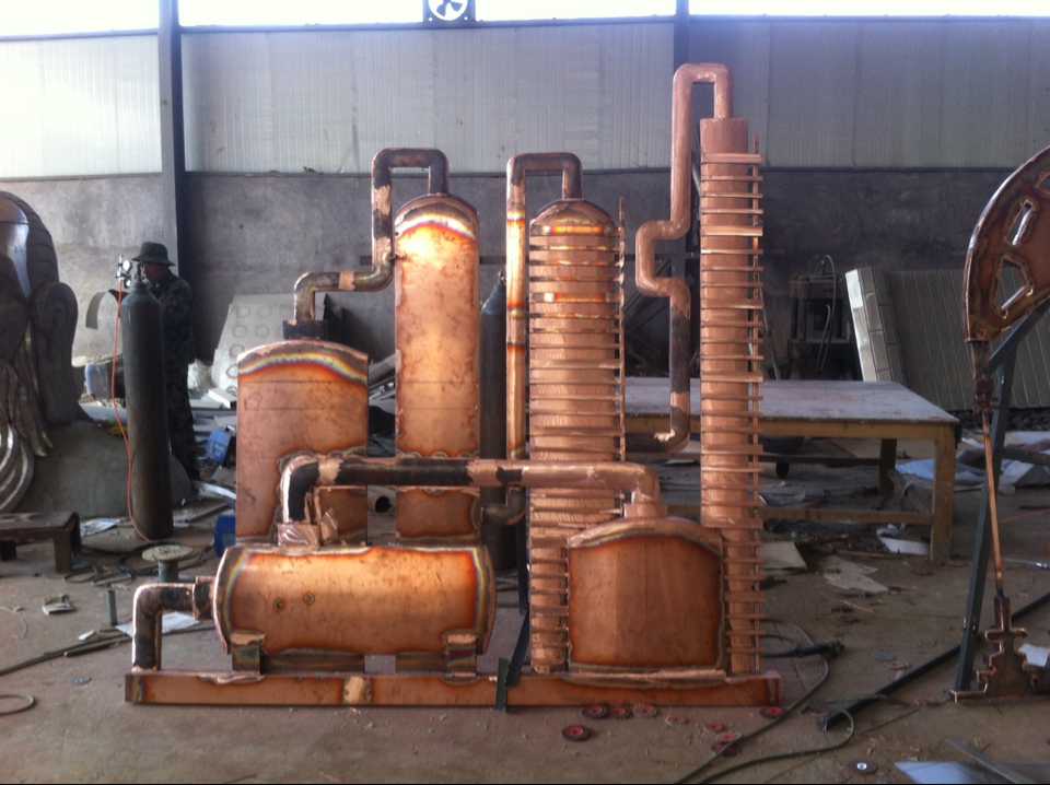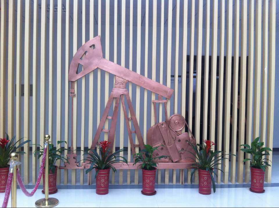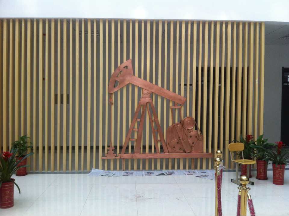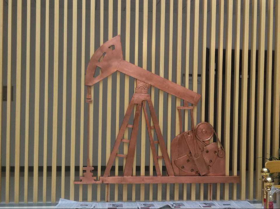 抽油機(jī)及化工廠鍛銅浮雕,2015年10月23日安裝于中國石油大學(xué)華東分校(青島市黃島區(qū))。材質(zhì):紫銅板。工藝:手工鍛銅。高:2.19米。