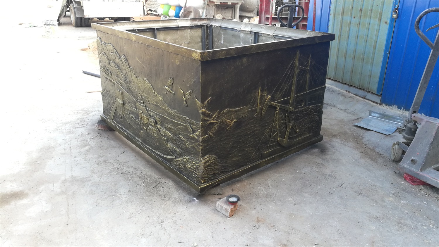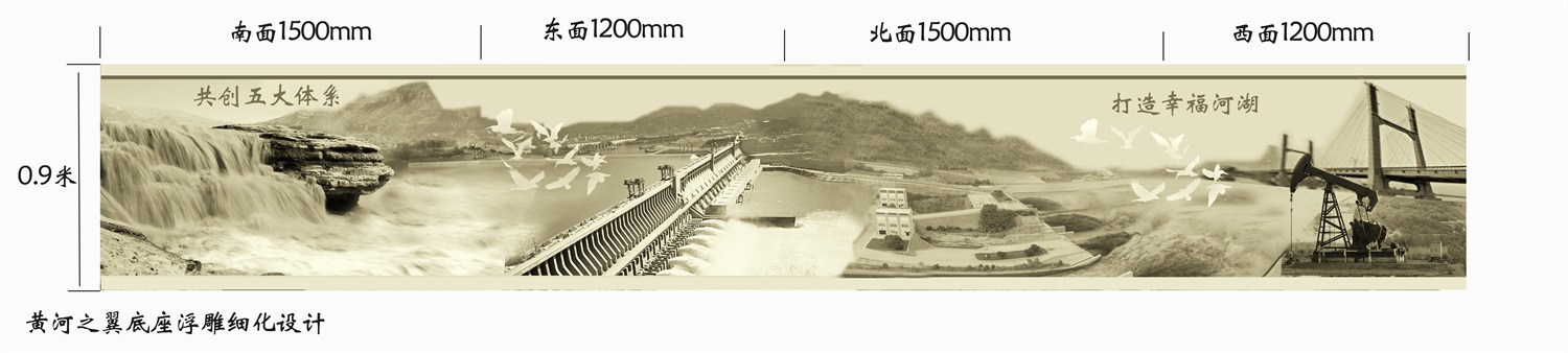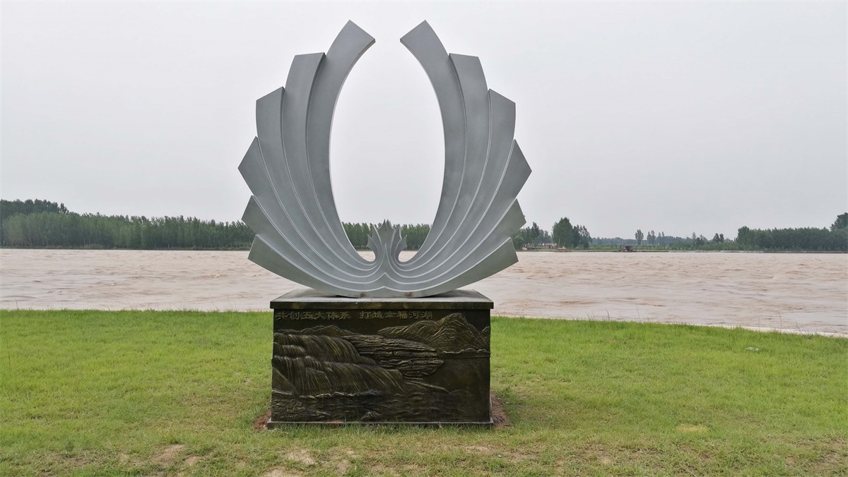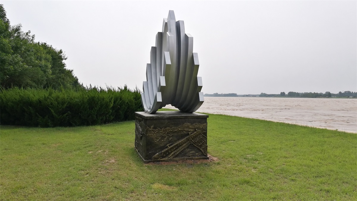 “黃河之翼”雕塑取形抽象翅膀、也像海浪,寓意黃河實業(yè)的騰飛和理想;像花朵,寓意著美好幸福;中心的花心,寓意著黃河不變的初心。底座浮雕體現(xiàn):共創(chuàng)五大體系,打造幸福河湖、堅實的堤防、生態(tài)補(bǔ)水(水閘引水)、人水和諧(濕地飛鳥)、勝利油田、滄海桑田(肥沃農(nóng)田)等。